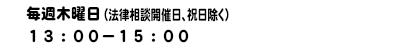 毎週木曜日 (法律相談日、祝日除く) 13:00-15:00 |