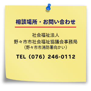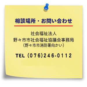 「生活福祉資金」や「助け合い金庫」の貸付制度についての相談に応じます。 問い合わせ(076)248-8210 |